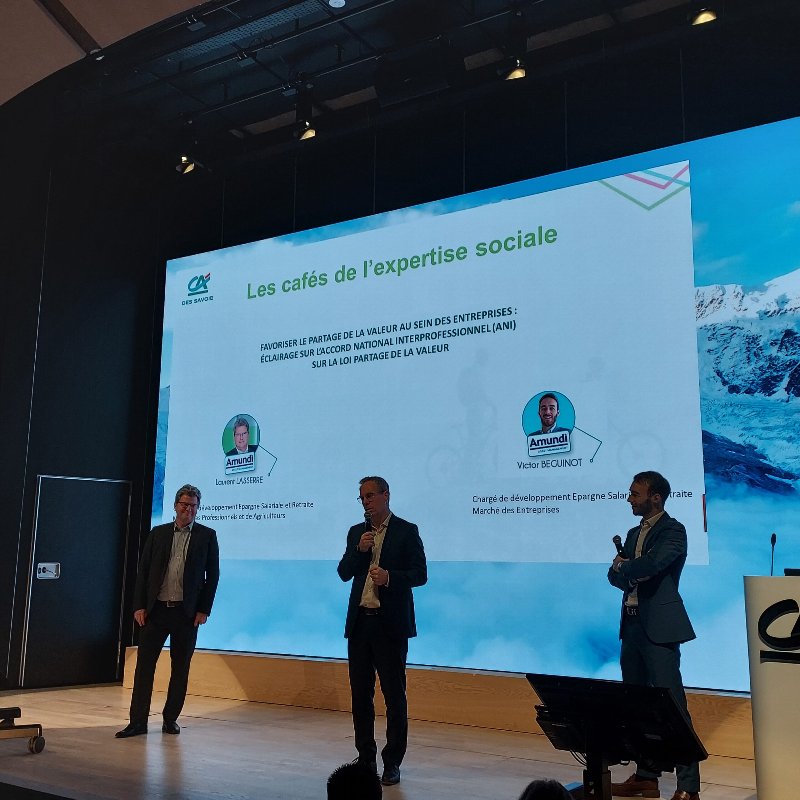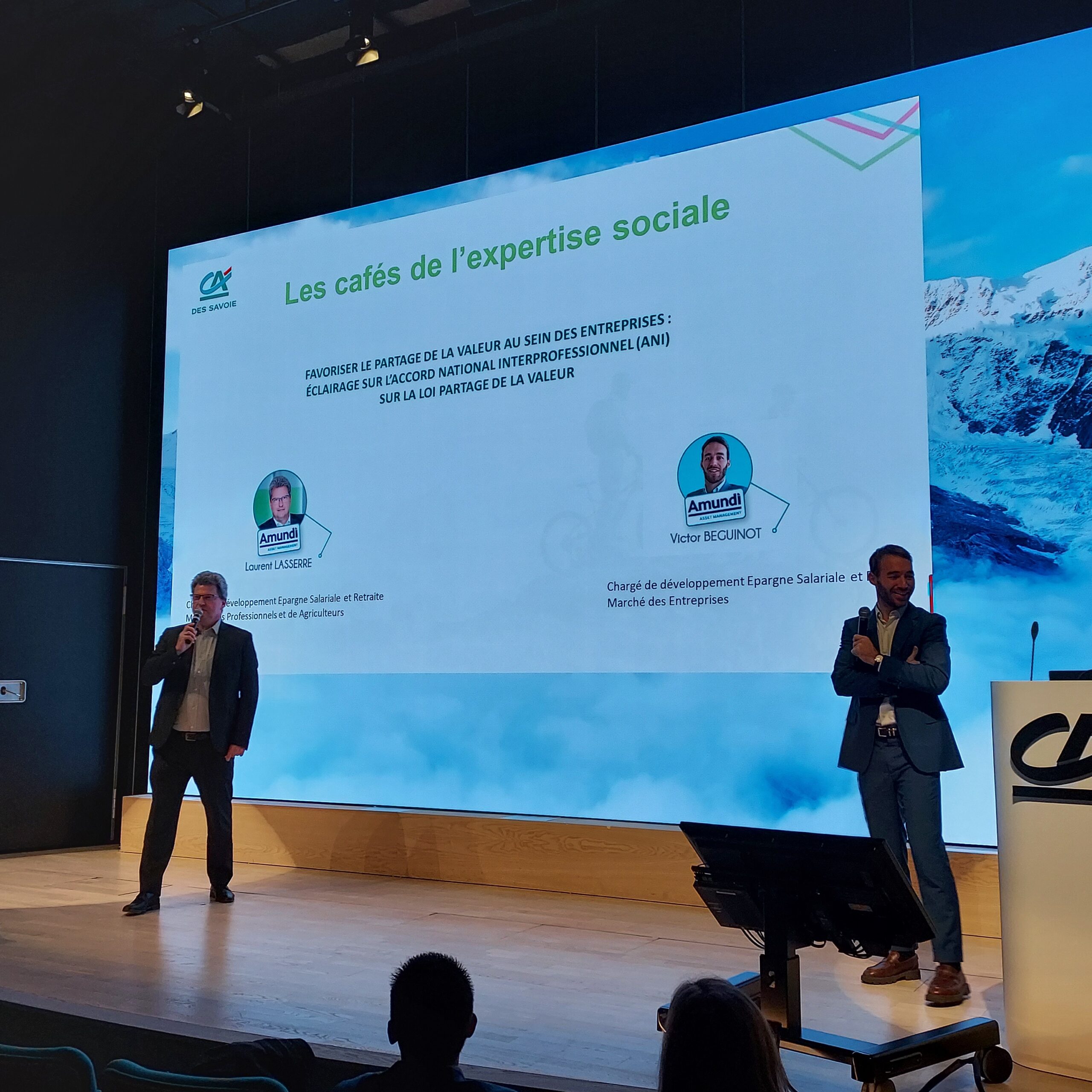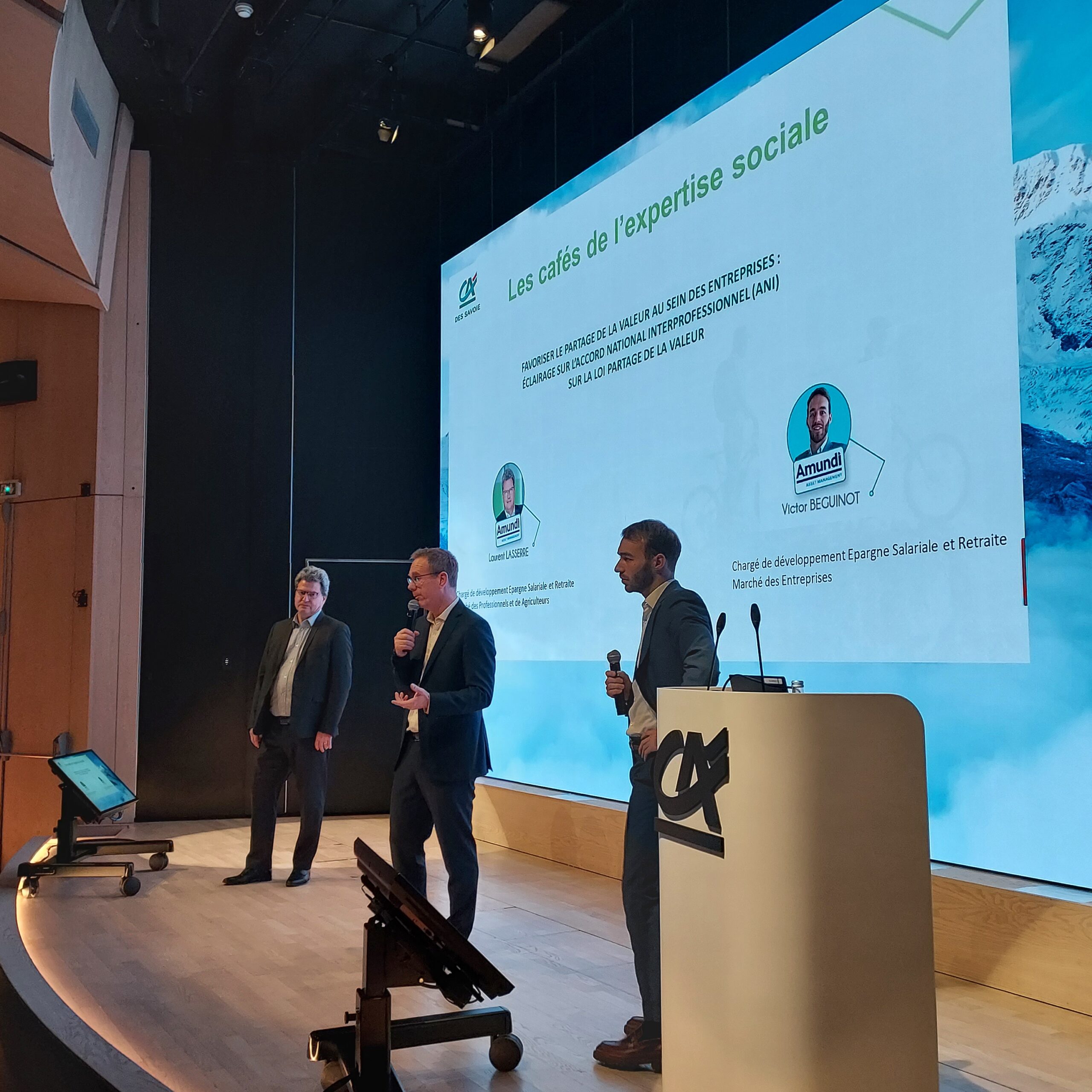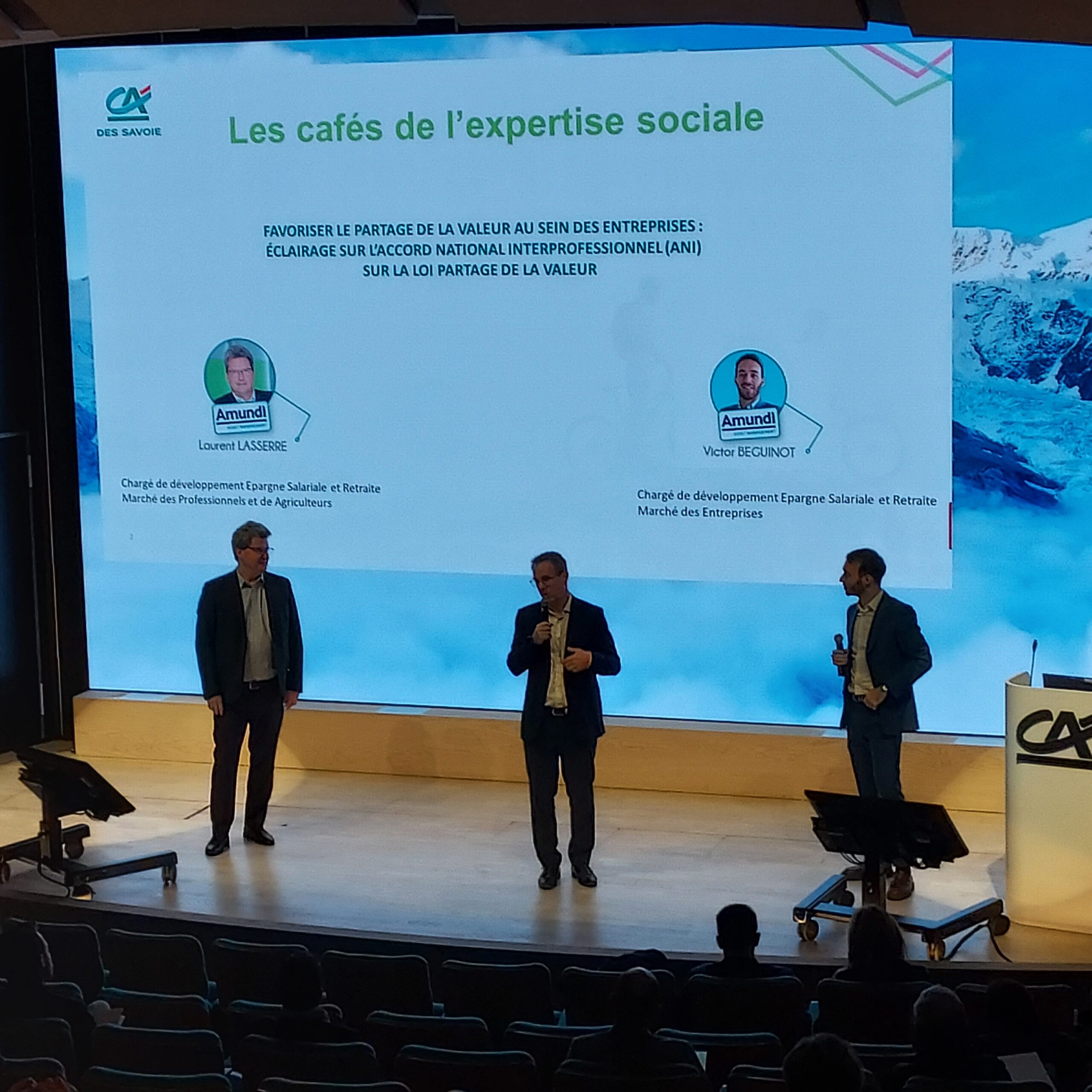 Ce vendredi 08 décembre, les experts d’Amundi, Laurent LASSERRE – Chargé de développement ESR Marché des Professionnels et des Agriculteurs – et Victor BEGUINOT – Chargé d’affaires Epargne Salariale et Retraite Marché des Entreprises ont présenté aux clients et collaborateurs du Crédit Agricole des Savoie l’Accord National Interprofessionnel (ANI) sur la loi partage de la valeur. Une occasion pour les entreprises concernées d’échanger avec ces experts.